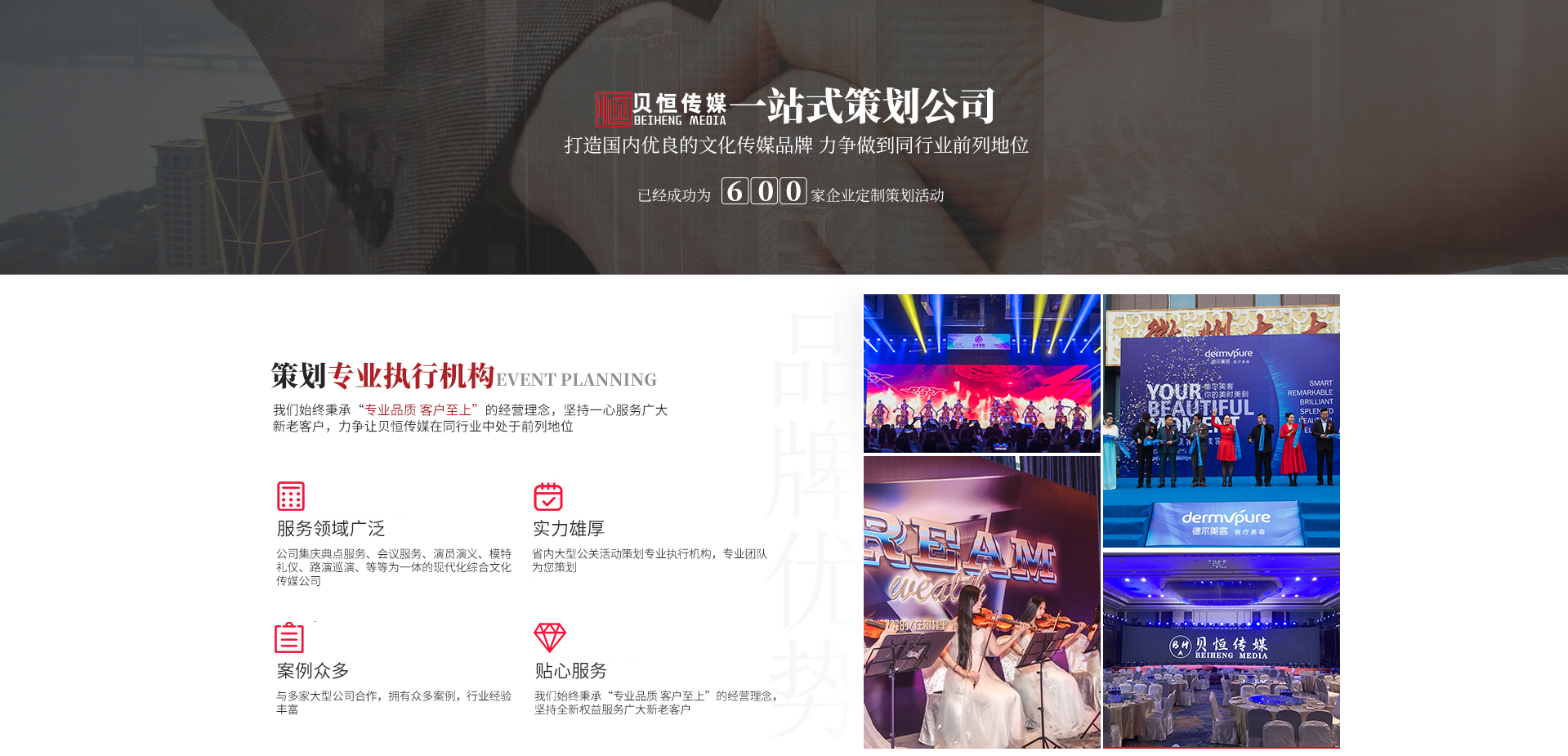 合 肥 貝 恒 文 化 傳 媒 專(zhuān)注·專(zhuān)業(yè)·專(zhuān)心·效率   合肥貝恒文化傳媒有限公司2017年成立于安徽·合肥,是省內(nèi)大型公關(guān)活動(dòng)策劃專(zhuān)業(yè)執(zhí)行機(jī)構(gòu),公司集慶典服務(wù)、會(huì)議服務(wù)、演員演藝、模特禮儀、路演巡演、展會(huì)特裝、廣告制作、設(shè)備租賃、舞美策劃、企業(yè)形象宣傳等為一體的現(xiàn)代化綜合文化傳媒公司,我們始終秉承“專(zhuān)業(yè)品質(zhì)客戶(hù)至上”的經(jīng)營(yíng)理念,堅(jiān)持全...